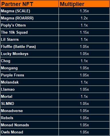 Holding certain NFTs while you hold gMON earns you the following multipliers. Only your highest NFT multiplier applies.